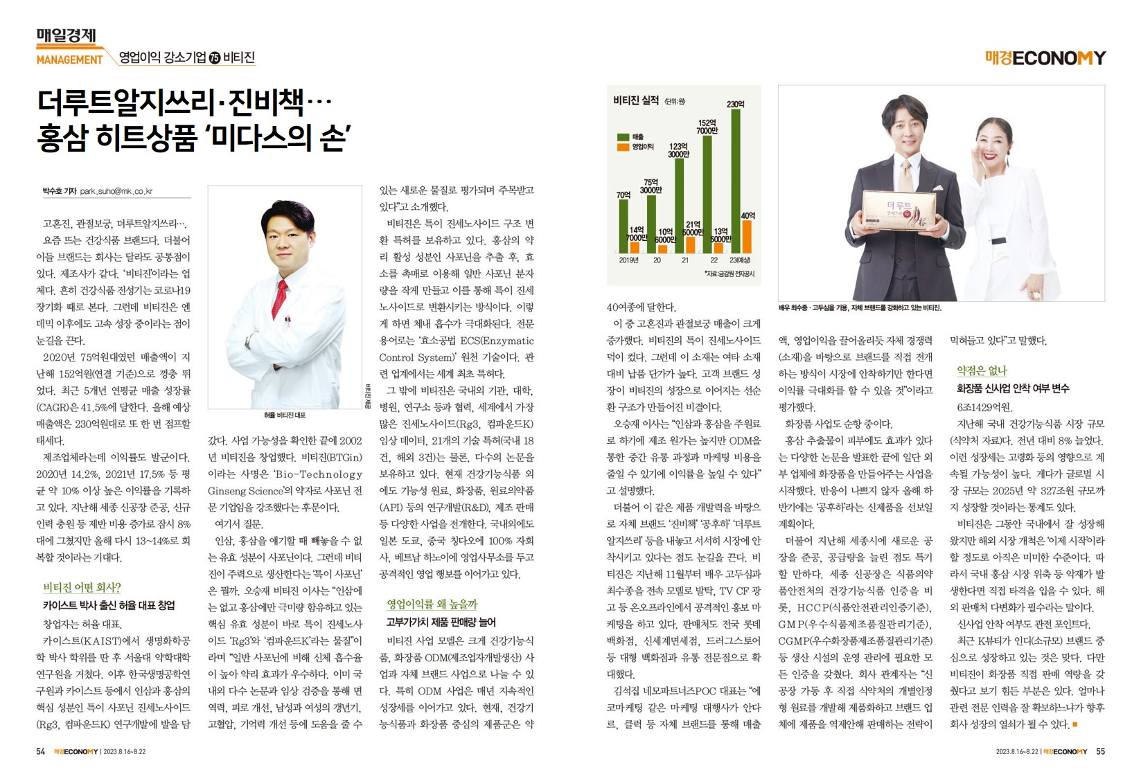 ´õ·çÆ®¾ËÁö¾²¸®, ÁøºñÃ¥¡¦È«»ï È÷Æ®»óǰ ¡®¹Ì´Ù½ºÀÇ ¼Õ¡¯ [¿µ¾÷ÀÌÀÍ °¼Ò±â¾÷]º¸µµ : 2023.08.11°íÈ¥Áø, °üÀýº¸±Ã, ´õ·çÆ®¾ËÁö¾²¸®¡¦.¿äÁò ¶ß´Â °Ç°½Äǰ ºê·£µå´Ù. ´õºÒ¾î ÀÌµé ºê·£µå´Â ȸ»ç´Â ´Þ¶óµµ °øÅëÁ¡ÀÌ ÀÖ´Ù. Á¦Á¶»ç°¡ °°´Ù. ¡®ºñƼÁø¡¯À̶ó´Â ¾÷ü´Ù. ÈçÈ÷ °Ç°½Äǰ Àü¼º±â´Â Äڷγª19 Àå±âÈ ¶§·Î º»´Ù. ±×·±µ¥ ºñƼÁøÀº ¿£µ¥¹Í ÀÌÈÄ¿¡µµ °í¼Ó ¼ºÀå ÁßÀ̶ó´Â Á¡ÀÌ ´«±æÀ» ²ö´Ù.2020³â 75¾ï¿ø´ë¿´´ø ¸ÅÃâ¾×ÀÌ Áö³ÇØ 152¾ï¿ø(¿¬°á ±âÁØ)À¸·Î ²±Ãæ ¶Ù¾ú´Ù. ÃÖ±Ù 5°³³â ¿¬Æò±Õ ¸ÅÃâ ¼ºÀå·ü(CAGR)Àº 41.5%¿¡ ´ÞÇÑ´Ù. ¿ÃÇØ ¿¹»ó ¸ÅÃâ¾×Àº 230¾ï¿ø´ë·Î ¶Ç ÇÑ ¹ø Á¡ÇÁÇÒ Å¼¼´Ù.Á¦Á¶¾÷ü¶ó´Âµ¥ ÀÌÀÍ·üµµ ¹ß±ºÀÌ´Ù. 2020³â 14.2%, 2021³â 17.5% µî Æò±Õ ¾à 10% ÀÌ»ó ³ôÀº ÀÌÀÍ·üÀ» ±â·ÏÇϰí ÀÖ´Ù. Áö³ÇØ ¼¼Á¾ ½Å°øÀå Áذø, ½Å±Ô ÀÎ·Â Ãæ¿ø µî Á¦¹Ý ºñ¿ë Áõ°¡·Î Àá½Ã 8%´ë¿¡ ±×ÃÆÁö¸¸ ¿ÃÇØ ´Ù½Ã 13~14%·Î ȸº¹ÇÒ °ÍÀ̶ó´Â ±â´ë´Ù.ºñƼÁø ¾î¶² ȸ»ç?Ä«À̽ºÆ® ¹Ú»ç Ãâ½Å ÇãÀ² ´ëÇ¥ â¾÷â¾÷ÀÚ´Â ÇãÀ² ´ëÇ¥. Ä«À̽ºÆ®(KAIST)¿¡¼ »ý¸íÈÇаøÇÐ ¹Ú»ç ÇÐÀ§¸¦ µý ÈÄ ¼¿ï´ë ¾àÇдëÇÐ ¿¬±¸¿øÀ» °ÅÃÆ´Ù. ÀÌÈÄ Çѱ¹»ý¸í°øÇבּ¸¿ø°ú Ä«À̽ºÆ® µî¿¡¼ Àλï°ú È«»ïÀÇ ÇÙ½É ¼ººÐÀΠƯÀÌ »çÆ÷´Ñ Áø¼¼³ë»çÀ̵å(Rg3, ÄÄÆÄ¿îµåK) ¿¬±¸°³¹ß¿¡ ¹ßÀ» ´ã°¬´Ù. »ç¾÷ °¡´É¼ºÀ» È®ÀÎÇÑ ³¡¿¡ 2002³â ºñƼÁøÀ» â¾÷Çß´Ù. ºñƼÁø(BTGin)À̶ó´Â »ç¸íÀº ¡®Bio-Technology Ginseng Science¡¯ÀÇ ¾àÀÚ·Î »çÆ÷´Ñ Àü¹® ±â¾÷ÀÓÀ» °Á¶Çß´Ù´Â ÈĹ®ÀÌ´Ù.¿©±â¼ Áú¹®.Àλï, È«»ïÀ» ¾ê±âÇÒ ¶§ »©³õÀ» ¼ö ¾ø´Â À¯È¿ ¼ººÐÀÌ »çÆ÷´ÑÀÌ´Ù. ±×·±µ¥ ºñƼÁøÀÌ ÁÖ·ÂÀ¸·Î »ý»êÇÑ´Ù´Â ¡®Æ¯ÀÌ »çÆ÷´Ñ¡¯Àº ¹»±î. ¿À½ÂÀç ºñƼÁø ÀÌ»ç´Â ¡°Àλ£´Â ¾ø°í È«»ï¿¡¸¸ ±Ø¹Ì·® ÇÔÀ¯Çϰí ÀÖ´Â ÇÙ½É À¯È¿ ¼ººÐÀÌ ¹Ù·Î ƯÀÌ Áø¼¼³ë»çÀÌµå ¡®Rg3¡¯¿Í ¡®ÄÄÆÄ¿îµåK¡¯¶ó´Â ¹°Áú¡±À̶ó¸ç ¡°ÀÏ¹Ý »çÆ÷´Ñ¿¡ ºñÇØ ½Åü Èí¼öÀ²ÀÌ ³ô¾Æ ¾à¸® È¿°ú°¡ ¿ì¼öÇÏ´Ù. ÀÌ¹Ì ±¹³»¿Ü ´Ù¼ö ³í¹®°ú ÀÓ»ó °ËÁõÀ» ÅëÇØ ¸é¿ª·Â, ÇÇ·Î °³¼±, ³²¼º°ú ¿©¼ºÀÇ °»³â±â, °íÇ÷¾Ð, ±â¾ï·Â °³¼± µî¿¡ µµ¿òÀ» ÁÙ ¼ö ÀÖ´Â »õ·Î¿î ¹°Áú·Î Æò°¡µÇ¸ç ÁÖ¸ñ¹Þ°í ÀÖ´Ù¡±°í ¼Ò°³Çß´Ù.ºñƼÁøÀº ƯÀÌ Áø¼¼³ë»çÀÌµå ±¸Á¶ º¯È¯ ƯÇ㸦 º¸À¯Çϰí ÀÖ´Ù. È«»ïÀÇ ¾à¸® Ȱ¼º ¼ººÐÀÎ »çÆ÷´ÑÀ» ÃßÃâ ÈÄ, È¿¼Ò¸¦ Ã˸ŷΠÀÌ¿ëÇØ ÀÏ¹Ý »çÆ÷´Ñ ºÐÀÚ·®À» ÀÛ°Ô ¸¸µé°í À̸¦ ÅëÇØ ƯÀÌ Áø¼¼³ë»çÀ̵å·Î º¯È¯½ÃŰ´Â ¹æ½ÄÀÌ´Ù. ÀÌ·¸°Ô Çϸé ü³» Èí¼ö°¡ ±Ø´ëȵȴÙ. Àü¹® ¿ë¾î·Î´Â ¡®È¿¼Ò°ø¹ý ECS(Enzymatic Control System)¡¯ ¿øÃµ ±â¼úÀÌ´Ù. °ü·Ã ¾÷°è¿¡¼´Â ¼¼°è ÃÖÃÊ Æ¯Çã´Ù.±× ¹Û¿¡ ºñƼÁøÀº ±¹³»¿Ü ±â°ü, ´ëÇÐ, º´¿ø, ¿¬±¸¼Ò µî°ú Çù·Â, ¼¼°è¿¡¼ °¡Àå ¸¹Àº Áø¼¼³ë»çÀ̵å(Rg3, ÄÄÆÄ¿îµåK) ÀÓ»ó µ¥ÀÌÅÍ, 21°³ÀÇ ±â¼ú ƯÇã(±¹³» 18°Ç, ÇØ¿Ü 3°Ç)´Â ¹°·Ð, ´Ù¼öÀÇ ³í¹®À» º¸À¯Çϰí ÀÖ´Ù. ÇöÀç °Ç°±â´É½Äǰ ¿Ü¿¡µµ ±â´É¼º ¿ø·á, ÈÀåǰ, ¿ø·áÀǾàǰ(API) µîÀÇ ¿¬±¸°³¹ß(R&D), Á¦Á¶ ÆÇ¸Å µî ´Ù¾çÇÑ »ç¾÷À» Àü°³ÇÑ´Ù. ±¹³»¿Ü¿¡µµ ÀϺ» µµÄì, Áß±¹ Ī´Ù¿À¿¡ 100% ÀÚȸ»ç, º£Æ®³² ÇϳëÀÌ¿¡ ¿µ¾÷»ç¹«¼Ò¸¦ µÎ°í °ø°ÝÀûÀÎ ¿µ¾÷ Çຸ¸¦ À̾°í ÀÖ´Ù.¿µ¾÷ÀÌÀÍ·ü ¿Ö ³ôÀ»±î°íºÎ°¡°¡Ä¡ Á¦Ç° ÆÇ¸Å·® ´Ã¾îºñƼÁø »ç¾÷ ¸ðµ¨Àº Å©°Ô °Ç°±â´É½Äǰ, ÈÀåǰ ODM(Á¦Á¶¾÷ÀÚ°³¹ß»ý»ê) »ç¾÷°ú ÀÚü ºê·£µå »ç¾÷À¸·Î ³ª´ ¼ö ÀÖ´Ù. ƯÈ÷ ODM »ç¾÷Àº ¸Å³â Áö¼ÓÀûÀÎ ¼ºÀå¼¼¸¦ À̾°í ÀÖ´Ù. ÇöÀç, °Ç°±â´É½Äǰ°ú ÈÀåǰ Áß½ÉÀÇ Á¦Ç°±ºÀº ¾à 40¿©Á¾¿¡ ´ÞÇÑ´Ù.ÀÌ Áß °íÈ¥Áø°ú °üÀýº¸±Ã ¸ÅÃâÀÌ Å©°Ô Áõ°¡Çß´Ù. ºñƼÁøÀÇ Æ¯ÀÌ Áø¼¼³ë»çÀÌµå ´öÀÌ ÄÇ´Ù. ±×·±µ¥ ÀÌ ¼ÒÀç´Â ¿©Å¸ ¼ÒÀç ´ëºñ ³³Ç° ´Ü°¡°¡ ³ô´Ù. °í°´ ºê·£µå ¼ºÀåÀÌ ºñƼÁøÀÇ ¼ºÀåÀ¸·Î À̾îÁö´Â ¼±¼øÈ¯ ±¸Á¶°¡ ¸¸µé¾îÁø ºñ°áÀÌ´Ù.¿À½ÂÀç ÀÌ»ç´Â ¡°Àλï°ú È«»ïÀ» ÁÖ¿ø·á·Î Çϱ⿡ Á¦Á¶ ¿ø°¡´Â ³ôÁö¸¸ ODMÀ» ÅëÇÑ Áß°£ À¯Åë °úÁ¤°ú ¸¶ÄÉÆÃ ºñ¿ëÀ» ÁÙÀÏ ¼ö Àֱ⿡ ÀÌÀÍ·üÀ» ³ôÀÏ ¼ö ÀÖ´Ù¡±°í ¼³¸íÇß´Ù.´õºÒ¾î ÀÌ °°Àº Á¦Ç° °³¹ß·ÂÀ» ¹ÙÅÁÀ¸·Î ÀÚü ºê·£µå ¡®ÁøºñÃ¥¡¯ ¡®°øÈÄÇÏ¡¯ ¡®´õ·çÆ®¾ËÁö¾²¸®¡¯ µîÀ» ³»³õ°í ¼¼È÷ ½ÃÀå¿¡ ¾ÈÂø½Ã۰í ÀÖ´Ù´Â Á¡µµ ´«±æÀ» ²ö´Ù. ºñƼÁøÀº Áö³ÇØ 11¿ùºÎÅÍ ¹è¿ì °íµÎ½É°ú ÃÖ¼öÁ¾À» Àü¼Ó ¸ðµ¨·Î ¹ßŹ, TV CF ±¤°í µî ¿Â¿ÀÇÁ¶óÀο¡¼ °ø°ÝÀûÀÎ È«º¸ ¸¶ÄÉÆÃÀ» Çϰí ÀÖ´Ù. ÆÇ¸Åóµµ Àü±¹ ·Ôµ¥¹éÈÁ¡, ½Å¼¼°è¸é¼¼Á¡, µå·¯±×½º